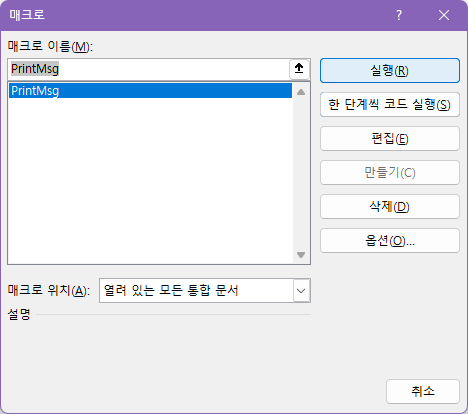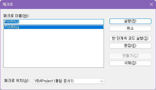 1번과 2번을 해보면 다음과 같은 창이 뜹니다. 아래 창에서 원하는 매크로를 선택해서 실행하면 동일한 결과를 얻을 수 있습니다.