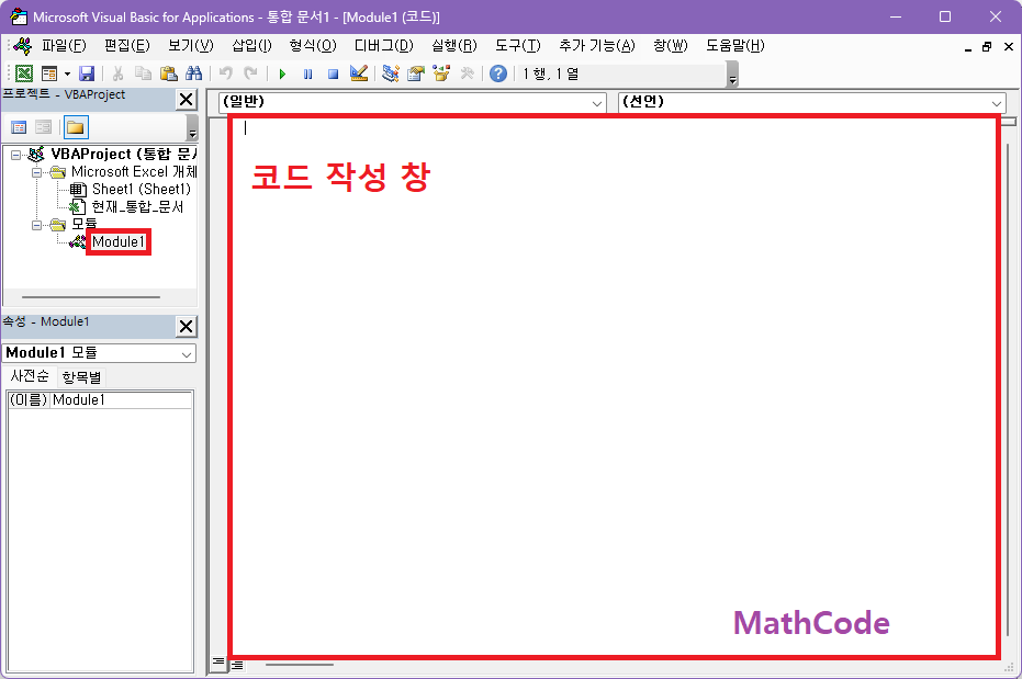 코드는 오른쪽 작성 창에 작성하면 됩니다. 이 창을 닫았거나 다른 창으로 이동해서 다시 열고 싶을 때는 'Module 1'을 더블클릭하면 다시 열립니다.
