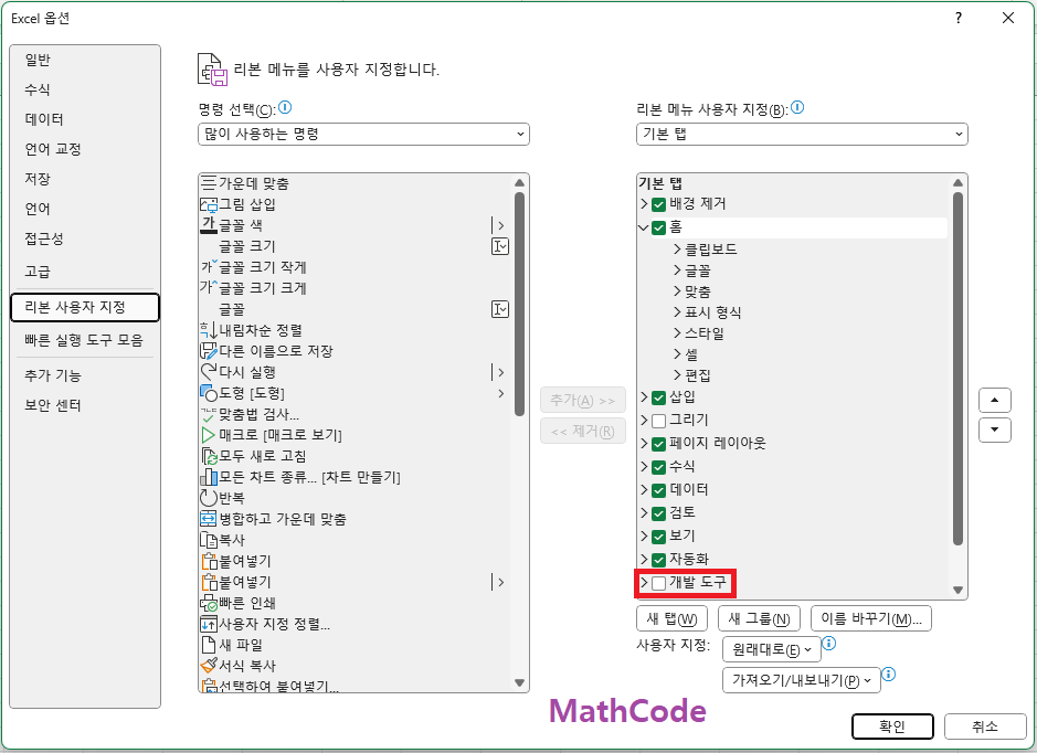 파일 > 옵션 > 리본 사용자 지정 > 개발 도구 체크박스 클릭