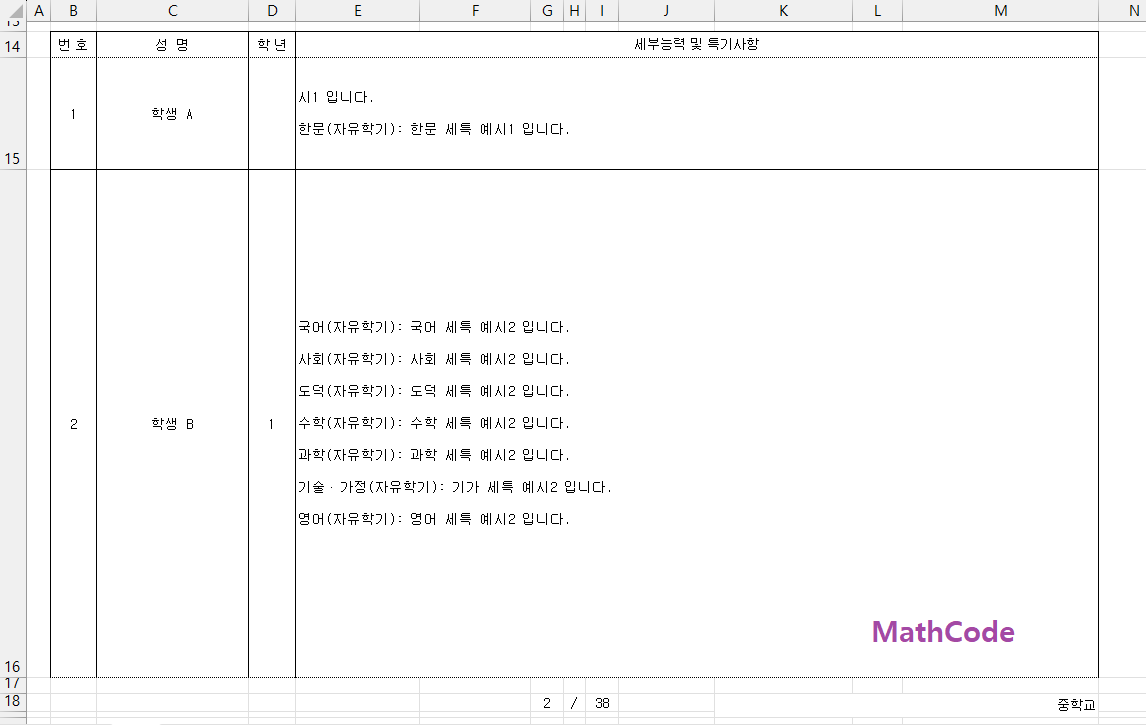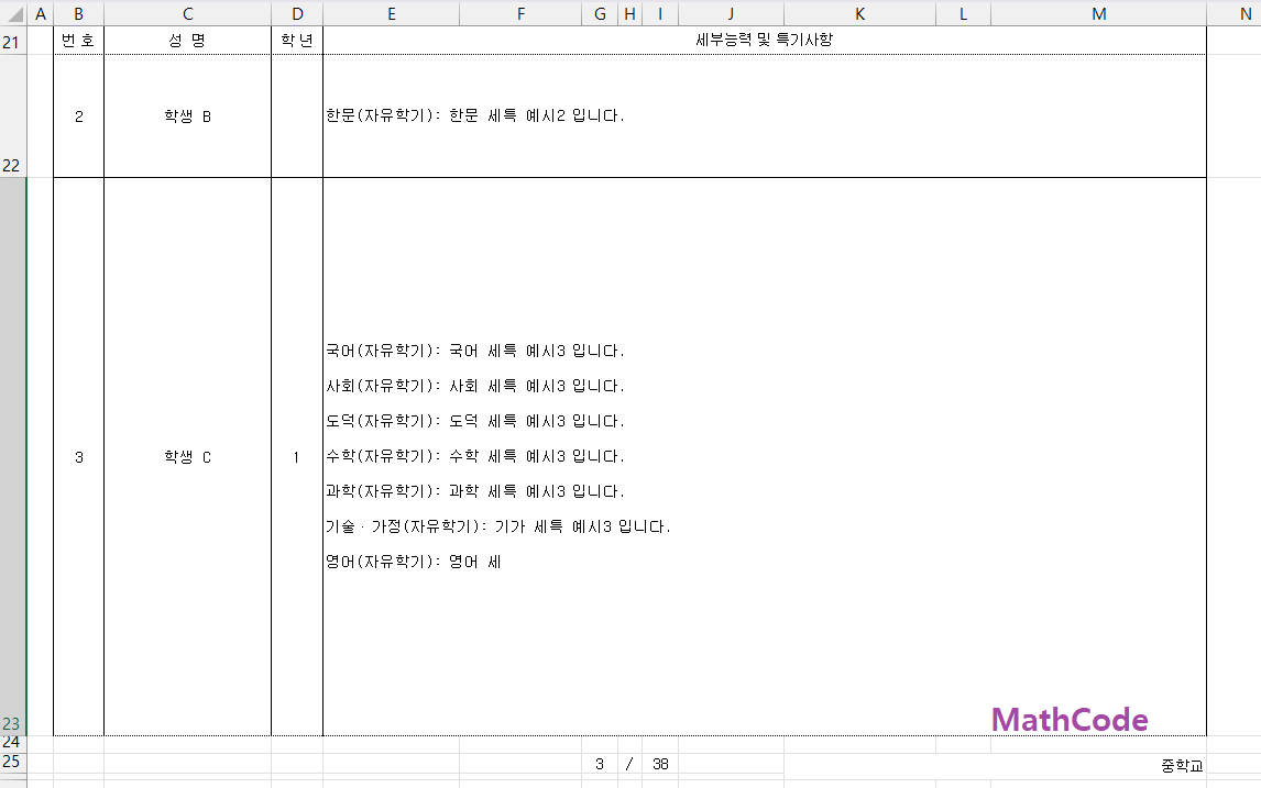 다음은 학교생활기록부 세부능력 및 특기사항(이하 세특)을 Excel로 내려받은 파일의 예시입니다.