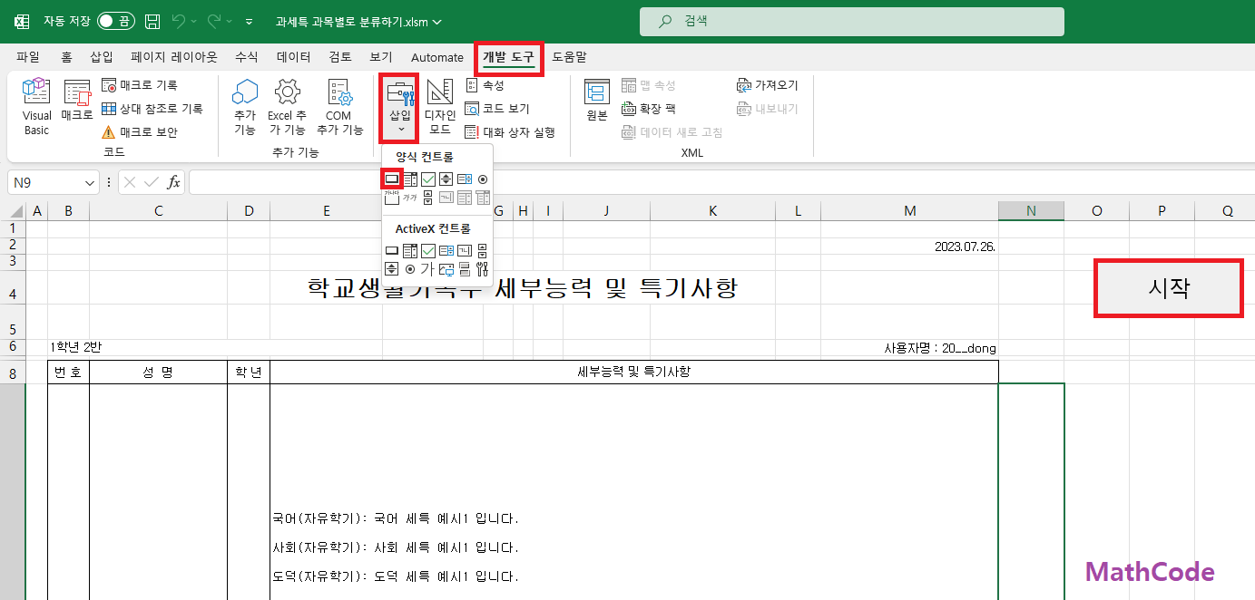 이전 포스트에서 다루었던 '개발 도구 > 삽입 > 단추'를 이용해서 버튼을 생성하고 main 함수를 연결합니다.
