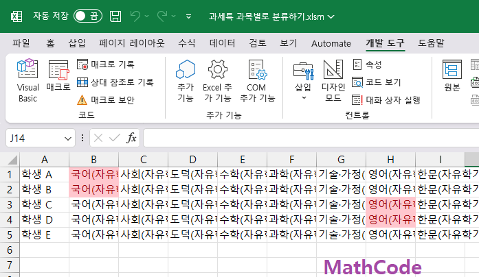 과목별, 학생별로 셀마다 정리해서 중복여부를 확인하고 싶습니다.